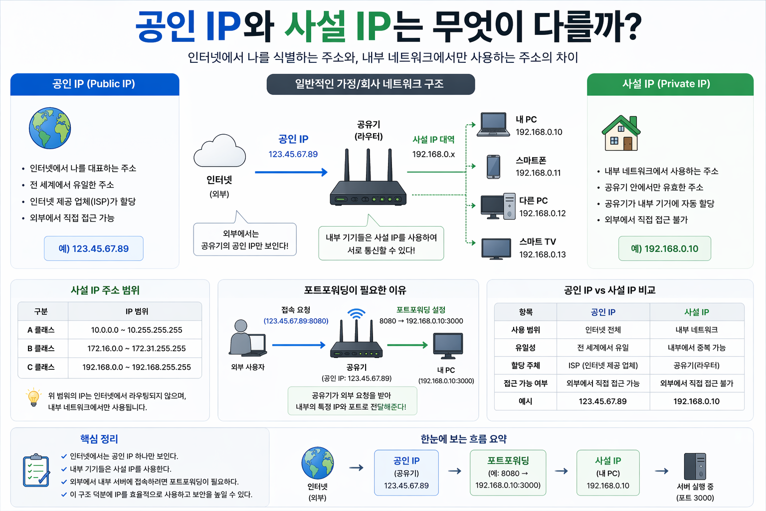 공인 IP는 인터넷에서 나를 대표하는 주소이고, 사설 IP는 내부 네트워크에서만 사용하는 주소다. 외부에서 내 컴퓨터에 접속하려면 공인 IP와 포트포워딩이 함께 필요하다.