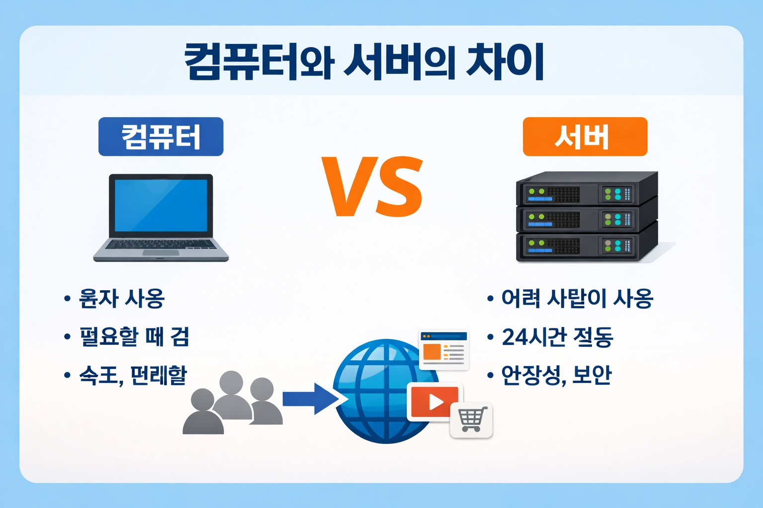 차이가 있다면 사용하는 목적이다. 일반 컴퓨터는 보통 한 사람이 사용한다. 문서를 작성하거나, 영화를 보거나, 게임을 하는 용도다. 반면 서버는 여러 사람에게 동시에 정보를 제공한다. 그래서 훨씬 더 오래 켜져 있어야 하고, 많은 사람이 접속해도 멈추지 않아야 한다.