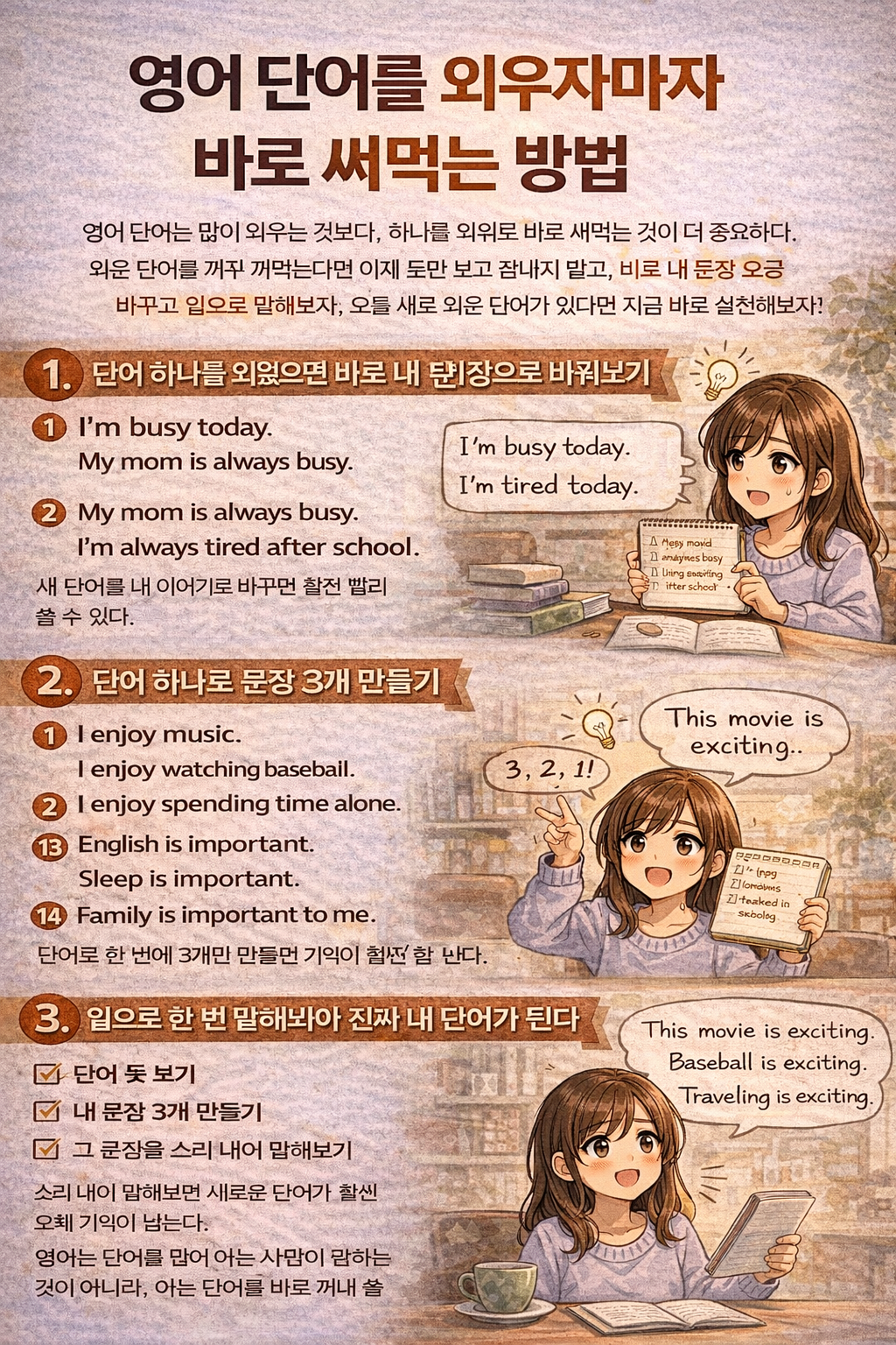 특히 문장을 3개 만들면 단어를 다양한 상황에서 써보게 되기 때문에 기억이 훨씬 오래간다. 한 문장만 만들었을 때보다 훨씬 자연스럽게 단어가 익숙해진다.