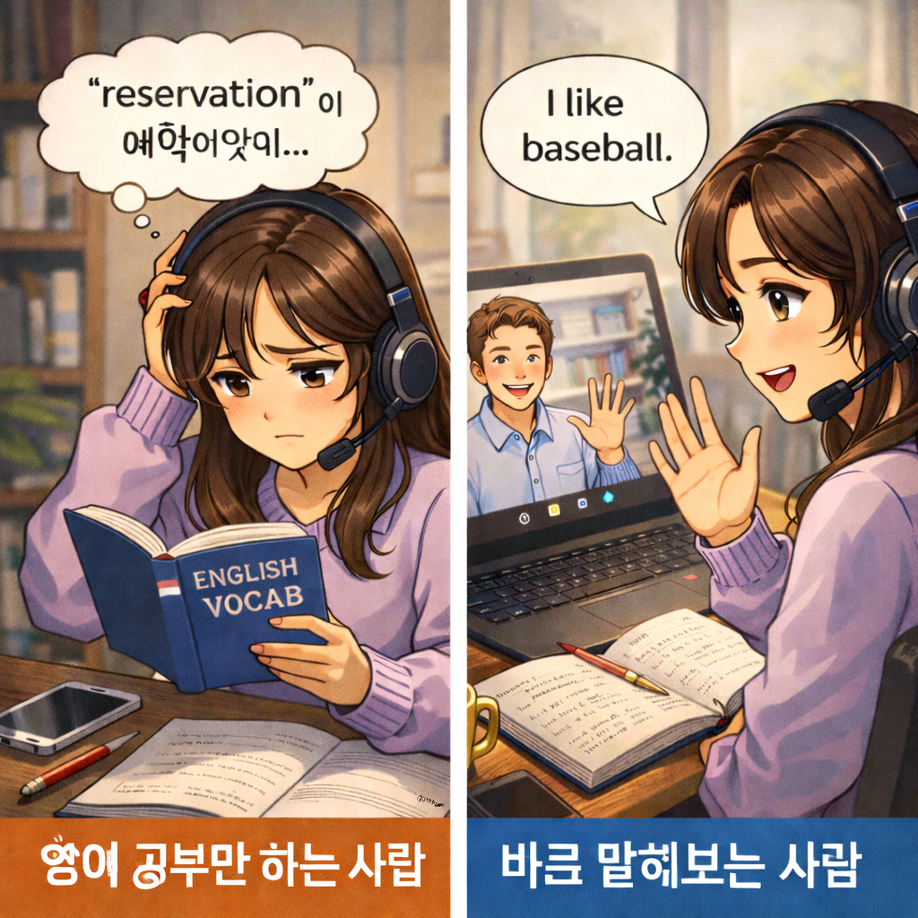 왜 이런 차이가 생기는 걸까? 영어는 단순히 많이 아는 공부가 아니라, 실제로 써보는 공부이기 때문이다. 그래서 영어를 잘하고 싶다면 단어만 외우는 것보다, 외운 단어를 바로 말해보는 습관이 훨씬 중요하다.