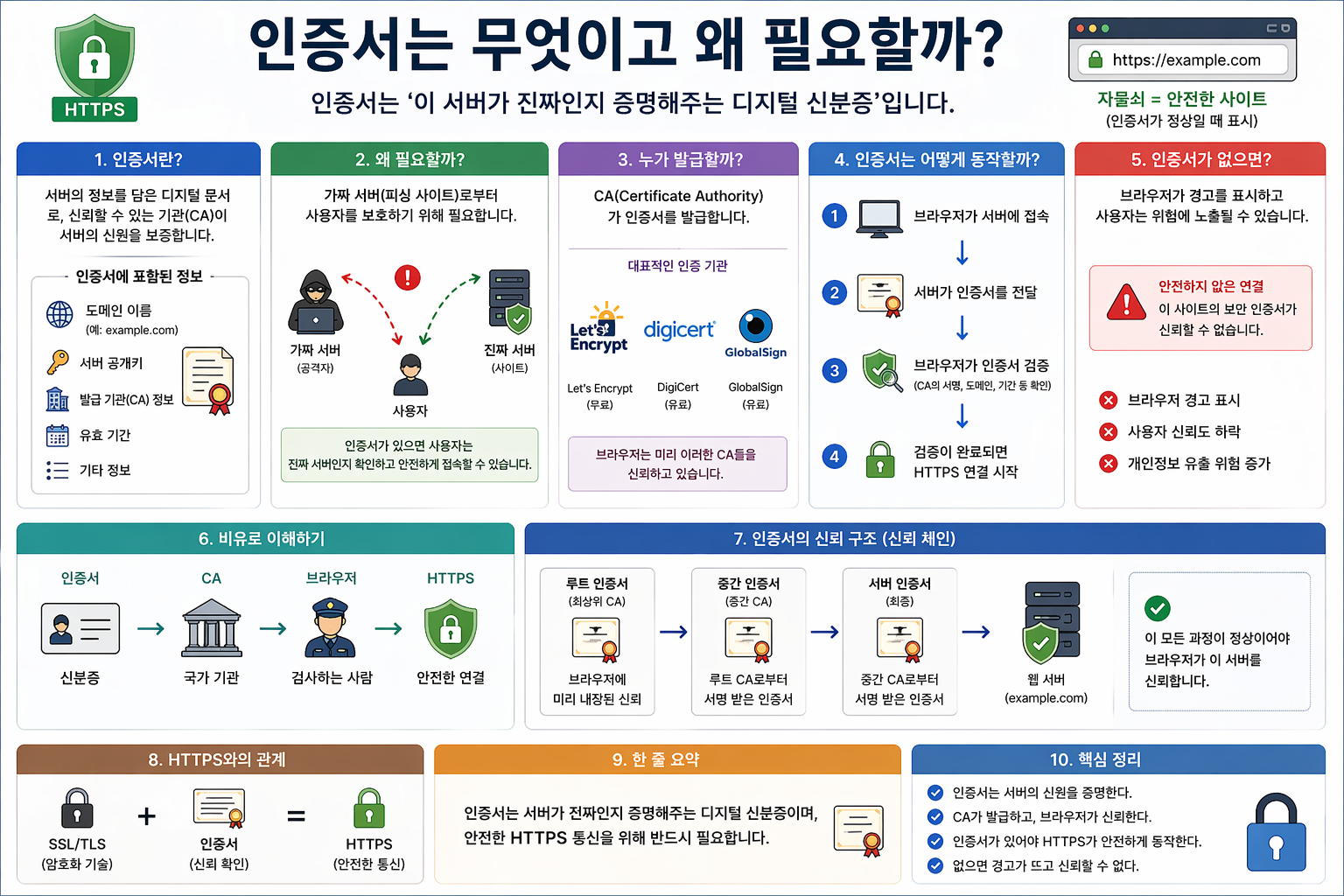 인증서는 서버가 진짜인지 증명해주는 디지털 신분증이며, 안전한 HTTPS 통신을 위해 반드시 필요하다.