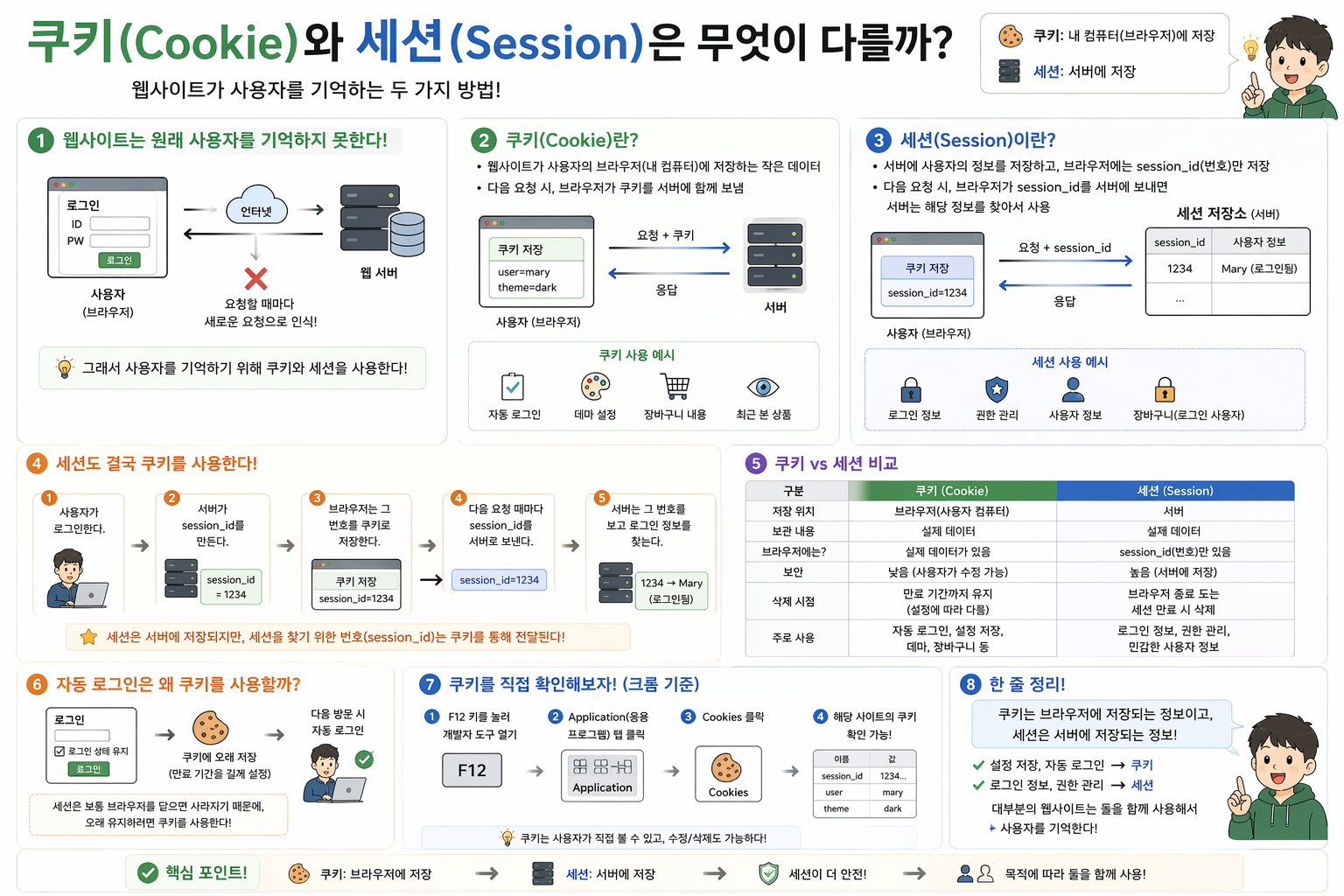 쿠키는 브라우저에 저장되는 정보이고, 세션은 서버에 저장되는 정보다.