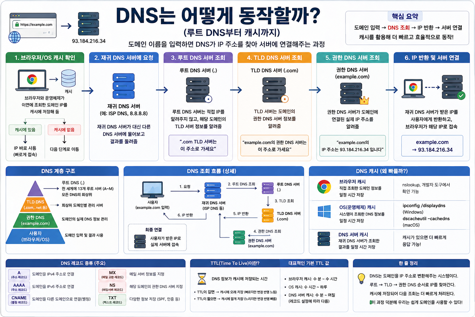 캐시 → 재귀 DNS → 루트 DNS → TLD DNS → 권한 DNS → IP 반환