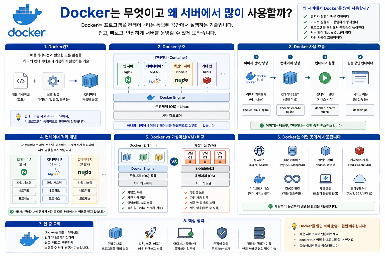 서버에서 Docker를 많이 쓰는 이유는 크게 3가지다.