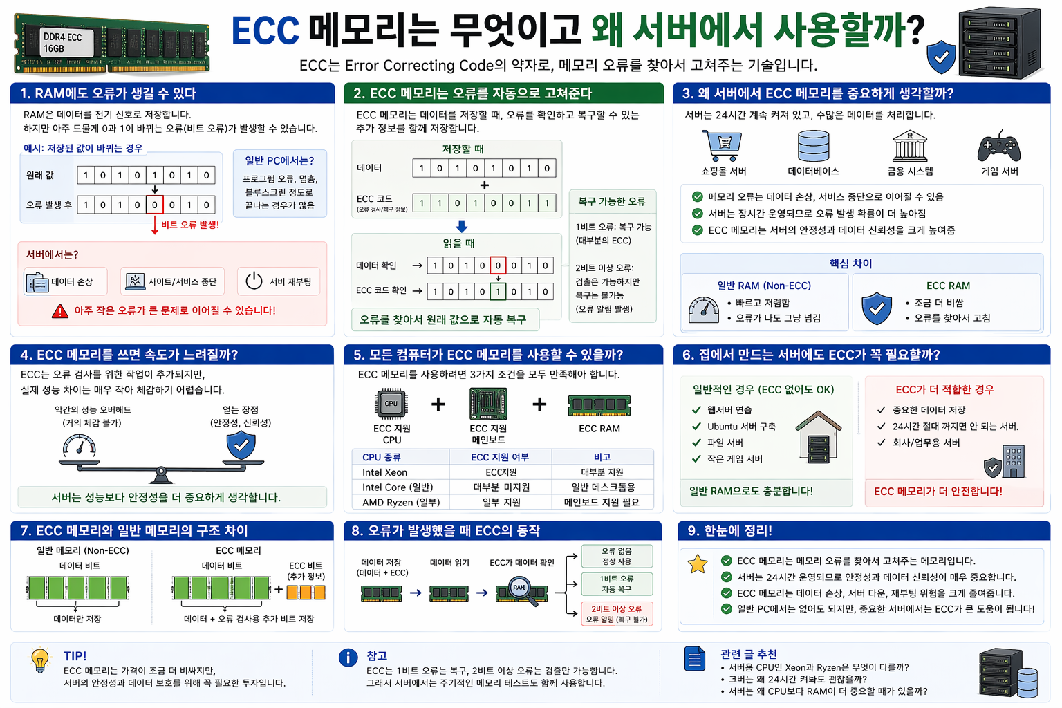 ECC 메모리는 RAM에 생기는 작은 오류를 자동으로 찾아서 고쳐주는 메모리다. 일반 컴퓨터에서는 없어도 되지만, 서버처럼 절대 멈추면 안 되는 컴퓨터에서는 안정성을 위해 많이 사용한다.