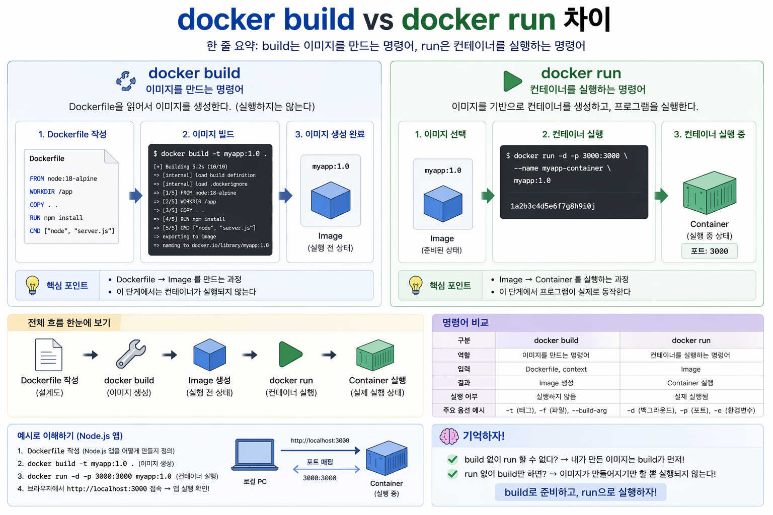 docker build는 이미지를 만드는 명령어이고, docker run은 그 이미지를 실행해서 컨테이너를 만드는 명령어다. 즉, build는 준비, run은 실행이다.